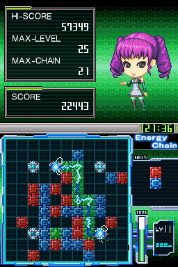 This one reminds me of Gunpey both mechanically and aesthetically, and like Gunpey, it doesn't really excite me. Blocks fall from above with little arrows on them, and the aim is to turn them so that the arrows point into lines, with 90 degree turns acceptable, and when a line is at least four blocks long, all the blocks will disappear. It's not a bad game, and it's pretty easy to set up mildly satisfying chains, but mild satisfaction is all it really offers. I don't dislike it as much as Black x Block, but it's not one I return to often.