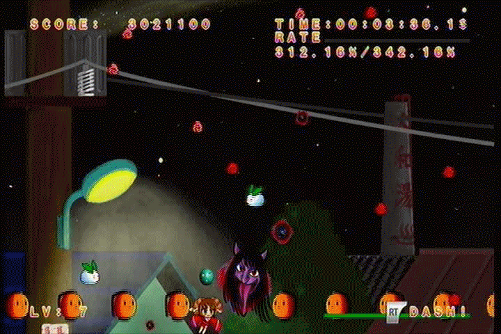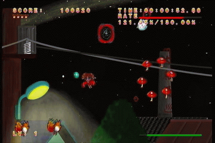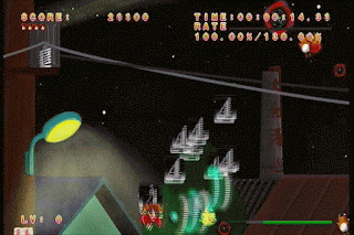 As the game goes on, bigger and stronger enemies appear, and from the point at which the large witches floating in the foetal position appear, you can stay in fever mode almost continuosly (as dashing through one of them is enough to completely fill the meter). Shortly after this happens, though, the game gets a lot more dangerous, as thicker hordes of smaller enemies start appearing, along with enemies that fire aimed lasers that go right across the playing field, as well as enemies that fire rings of revenge bullets in every direction and so on.