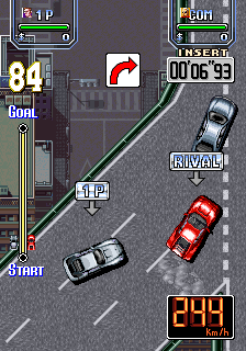 Instead the influence is more structural and stylistic. There are eight characters to choose from, each with their own cars (all of which are mis-spelled knock-offs of real cars), and their own stages. Their own stages because rather than being a game in which you race a whole load of cars round stadiums for several laps, Lethal Crash Race instead has short one-on-one races of about a minute in length, along various linear tracks all across the world. Not only that, but each character also has different quotes for the beginning and end of each race, my favourite being the rich old man who cheerily declares "this might be my last race."