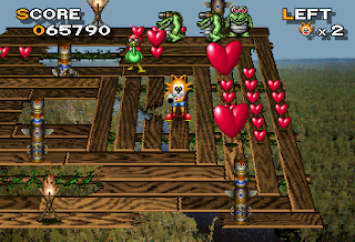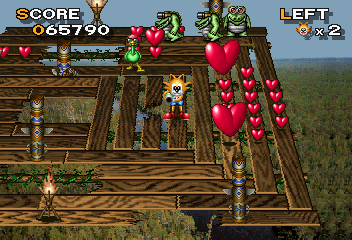 It's a pretty full-featured game, too. There's a couple of scoring systems in play, the main one revolving around collecting stars. Stars are one of a few random power-ups that can appear when you destroy one of the destructible items littered around each stage, and when you kill an enemy. As a side note, while the power-ups are random, you can shoot them to turn them into other power ups, so scoring isn't totally reliant on the kindness of the random number generator, which is nice. The stars, when collected, multiply the value of the hearts for a limited time. If you collect a star while one's already active, the multiplier increases by one. So, collecting stars, and doing it in quick succession, is obviously an important part of the scoring system.