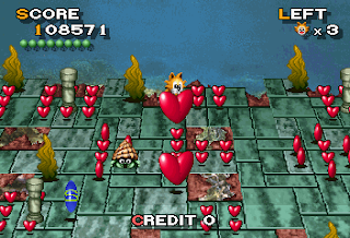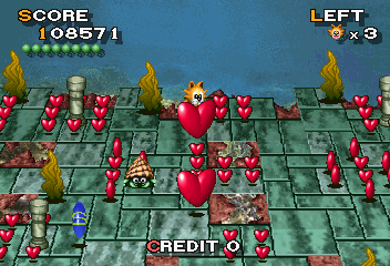 Pastel Island is an unreleased arcade prototype, though as far as I can tell, the only noticable bug it has is that the "INSERT COINS" text keeps flashing while you're playing, so it doesn't seem totally unfair to treat it as if its a finished game. And it's not like it's on sale anywhere or anything, so I'm hardly going to be tricking anyone into buying a stinker or anything. Anyway, it's a maze game from 1993 where, by the time-honoured tradition, you are tasked with collecting all the points items (this time they're hearts) in a stage, before going to the next stage and doing it there, and so on.
