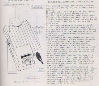 There's about 90 pages of actual content in here, along with a few blank "notes" pages, and some ads on the inside back cover. There's a section detailing all the different models of PC Engine, which even includes the LT and the LaserActiive, which is pretty impressive from a pre-WWW fanzine. Then there's a section on peripherals, the highlights being something called a "colour booster", which does... something to do with making the colours better on a "SCART PC Engine", as opposed to a PAL one. I know there were a small number of PAL PC Engines released by mail-order, but I have no idea what a SCART one might be, or why the colours need boosting, and half a page dedicated to the Magic Super Griffin. This is one of those big, old-fashioned piracy devices, that goes into the HuCard slot of your PC Engine, and connects to a floppy drive via parallel port. It cost £250, and the article claims that "It is quite legal, in the UK, to buy and use these copiers, so long as you do not sell the software", which sounds very dubious to me. There's also a small mention of a forthcoming, unnamed peripheral that will allow users to record up to an hour of broadcast tv to a CD. Was such a thing ever announced for the PC Engine? It sounds like some absurd fantasy.