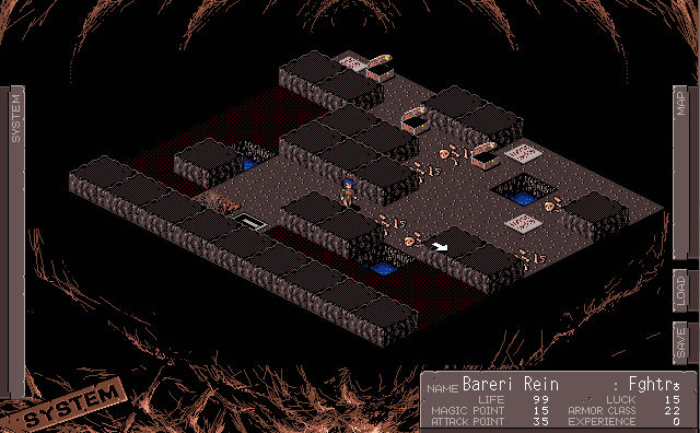 As mentioned, everything's seen from an isometric viewpoint, and the game is controlled with either the mouse or the arrow and Z/X keys. You don't directly move your character, you move an arrow around the screen, where it'll be pointing in one of four directions, then press Z to make them take one step in that direction. It's pretty slow, as the dungeon is procedurally generated and revealed one space at a time. Every now and then, you'll also enter a random battle. The commands for the battles aren't translated, so I'll tell you what they are here: from left to right, you've got escape, magic, and attack. Your item window is also open during battle, and oddly, using items and changing equipment doesn't use up a turn, so if you're about to die, you can just eat a load of bread until you get back to full health.