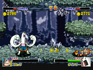 The fighting controls are simple, though they do have one odd little quirk: there's buttons for weak and strong attacks, as well as a third button that's only used in conjunction with direction inputs for specials and supers. Specials use up a third of your super meter, while supers use up the whole thing, but if you connect with your super, your opponent will drop a lot of coins, and coins fill up your meter.