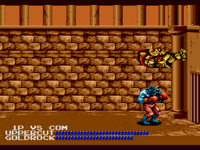 Each fight has only one round, and they all take place in small arenas with walls at each side. Combatants can be thrown into walls, adding even more damage to that inflicted by the already devastating throws. In single player mode, health is managed in a similar manner to survival modes seen in later fighting games: rather than just getting a full health bar for each stage, your health regenerates at the end of each fight, though it's pretty generous, and you'll often end up with at least as much health as you started with anyway.