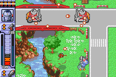 I'll be kind, and talk about the positive parts of the game first. Most of the game's positives stem from its presentation: in-game it looks great, with a very friendly, colourful pallette that's somewhat reminiscent of cartoons aimed at the very young. Everything's well-drawn and very detailed considering they low resolution of th GBA screen, and there's cute little touces, like cows in fields that run away when the player shoots at them. The TV cartoon presentation continues between stages, with eyecatches appearing before and after each stage. The character designs are all okay, though a little bland, and unfortunately, most of the enemies are pretty generic.
