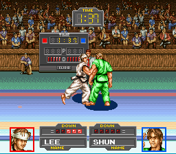 Since this is an attempt at a fairly realistic martial arts sports game, the characters are all just guys in Taekwon-Do outfits, and, in fact are all head and palette swaps of the same sprite. Don't take this as a negative, though: the developers have used this fact to their advantage, as that one sprite has a ton of expressive animation. Not only are there special reaction animations to getting hit by ceratin attacks, or in certain situations (for example, a character taking a strong hit to the gut will hunch over and hold themselves for a few frames, while a character being hit mid-jump will stumble on their feet when they land), but the fighters also show various levels of fatigue, which seem to be effected by various factors, such as the character's own stamina stat, the severity of the beating they've taken and the amount of jumping and other energetic moves they've performed. By the end of a particularly fierce bout, both characters will be breathing heavily, shoulders slumped and knees starting to buckle. This depth of animation really adds a lot to the game, and I'm slightly worried I'm not doing a good enough job of getting that across.