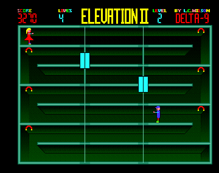 So, you're a little man, and you have to run across the floors of a building until you reach your lady love at the top. Obstructing you are elevators, with various levels of speed and erraticnes. It's incredibly simple: the only controls are left and right, and touching an elevator results in a lost life. There's also various kinds of items that fall from above at random intervals, including extra lives, invincibility, points bonuses and items that instantly move you up or down a floor.