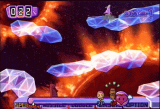 The actual act of playing is very similar to Smash Bros: you have buttons for jumping, normal and special attacks, throws and blocking. You do different attacks by pushing the analogue stick in the right direction while pressing one of the attack buttons. The most flagrant thing is that the shoulder buttons are used for blockng, and while blocking, you character crouches and gets surrounded by an impenetrable bubble. Shameless!