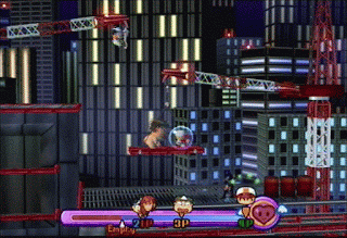 Yes, it's a crossover featuring characters from the videogame publisher Hudson Soft (providing characters from Bomberman, Bloody Roar and others), the toymakers Takara (represented by Transformers, Beyblade and some dolls) and the pachinko machine manufacturers* Konami (who probably have the most recoginsable line-up, having characters from Gradius, Twinbee, Castlevania, and some baseball series alongside the famous Mr. Dave Snake). Like most of these games, it doesn't use a traditional health bar system, instead having fights decided by a convoluted system involving coins with hearts on them.