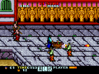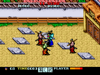 Obviously, you play as Itto, and you go about with your son in a backpack, slashing lots of guys to death. Though it's a belt scrolling beat em up, in terms of mechanical complexity, it inhabits a kind of middle ground between the simpler single plane beat em ups that came before it, like Spartan X, My Hero, et al., and the more complex belt scrollers that would come later, the Final Fights, the Streets of Rages, and so on. There's no comboing, but you do have a block button, and can perform a couple of different slashes with your sword by holding a direction as you press the attack button.