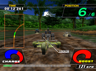 The "more" comes in the form of the fact that there are three different kinds of race: one the ground, in the air, and in the water. And they all feel totally different. My recommendation is to play a few air races first, as they're the easiest way to get used to the whole "dual acceleration" thing, and getting a handle on that makes all the races a lot easier. The water races are a lot harder to get a handle on, though, as your craft sways and bobs around on the water and swings like crazy on corners. The ground races are somewhere in the middle, of course, and after you've played a few they're not much more difficult to get through than a normal arcade-style racing game.