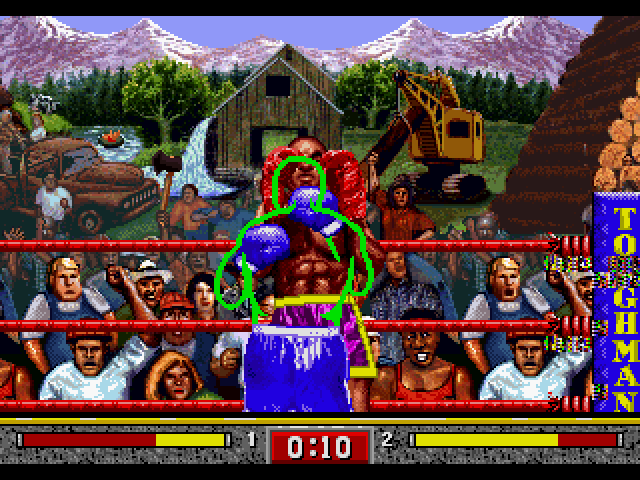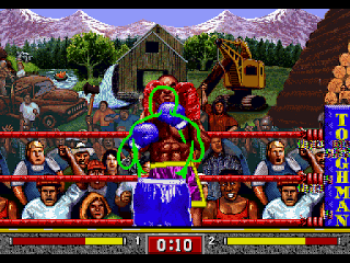 Presentation-wise, it's a bit of a mixed bag in many ways: though the graphics are all competently drawn, the game has an ugly pseudo-realistic aesthetic, and the menus look cheap and low-rent compared to the game itself. The character sprites are all massive, taking up most of the screen, though whoever you pick will always be represented by a green outline. A nice touch is that there are four tounaments in which you can compete: North America, South America, Europe/Middle East and Asia/Australasia, and each of them has their own (heavily stereotyped, in a Street Fighter kind of way) arena. As for how it plays, it's kind of like Super Punch-Out, but worse in every possible way.