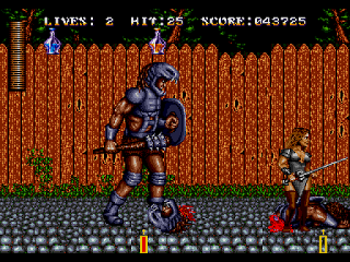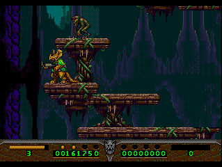 But the weirdness starts as soon as the game does, opening with a boss fight against a giant turtle-like monster that's climbing up the Hoover Dam and breathing fire. After you kill it, the credits start rolling before a cheeky little pterodactyl appears and tells you that was just a prank and the game actually starts now. This fight is also the first time that your HUD disappears, which is presumably some kind of resource-juggling programming trick based on the presence of the giant monster here, and the fact that it happens again when other giant bosses are onscreen. One thing you can always say in SOA's favour is that they were always trying different tricks and techniques to get fancy effects out of the Mega Drive hardware.